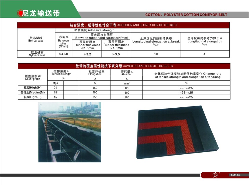 尼龍輸送帶具有帶體薄、自重輕,彈性好,強(qiáng)力高、耐磨耐沖擊,成槽性好,層間粘合力大,屈撓性優(yōu)異及使用壽命長等特點(diǎn)。 帶芯布層為尼龍帆布。 適用于中長距離,較高載量,高速條件下輸送物料,廣泛用于礦山、煤場、化工、冶金、建筑、港口等部門。