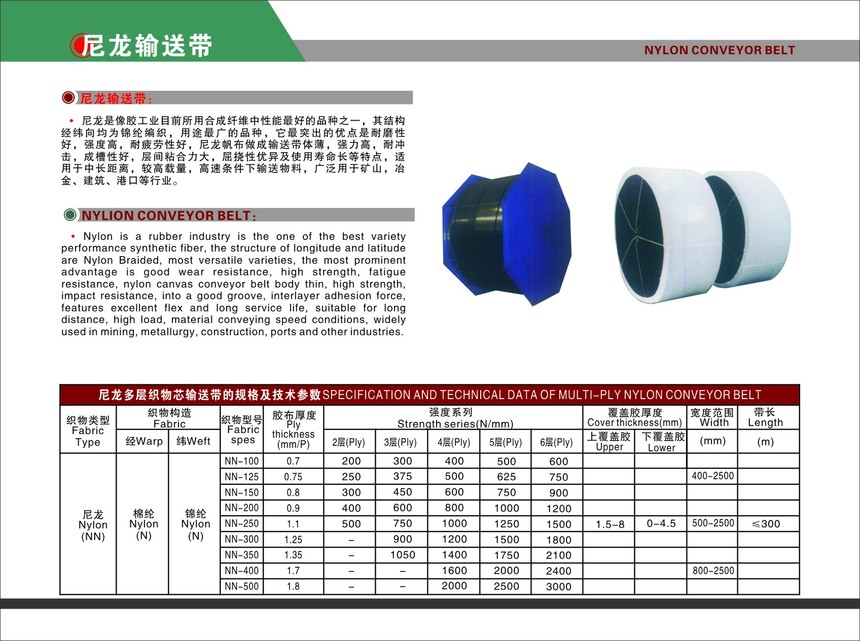 尼龍輸送帶具有帶體薄、自重輕,彈性好,強(qiáng)力高、耐磨耐沖擊,成槽性好,層間粘合力大,屈撓性優(yōu)異及使用壽命長等特點(diǎn)。 帶芯布層為尼龍帆布。 適用于中長距離,較高載量,高速條件下輸送物料,廣泛用于礦山、煤場、化工、冶金、建筑、港口等部門。