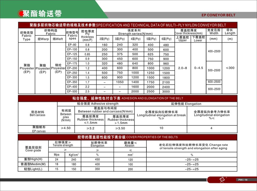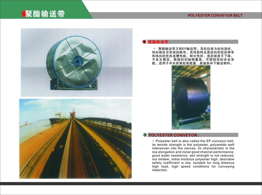 聚酯EP輸送帶具有耐熱穩(wěn)定性,耐水性,耐腐蝕性,拉伸強度大,帶體薄,重量輕,成槽性好,彈性好,耐磨抗沖擊。 適用于中長距離、較高裁量,高速條件下輸送物料。 帶芯布層為聚酯帆布。 EP輸送帶可廣泛應(yīng)用于煤炭、礦山、港口、冶金、電力、化工等領(lǐng)域輸送物料。